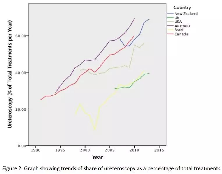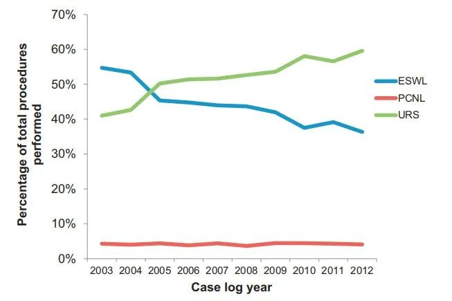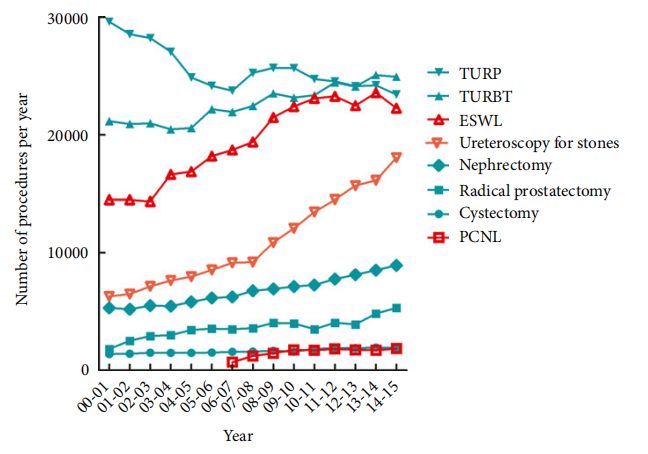 有调查发现,近20年来英国、美国、新西兰、澳大利亚、加拿大和巴西的泌尿结石患者数量增长了17%。其中,输尿管镜手术治疗的患者增长了251.8%,经皮肾镜取石术(PCNL)的患者比例较为稳定,接受冲击波碎石术(ESWL)和开放手术的患者比例分别下降了14.5%和12%。